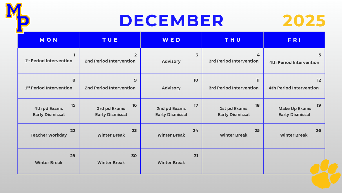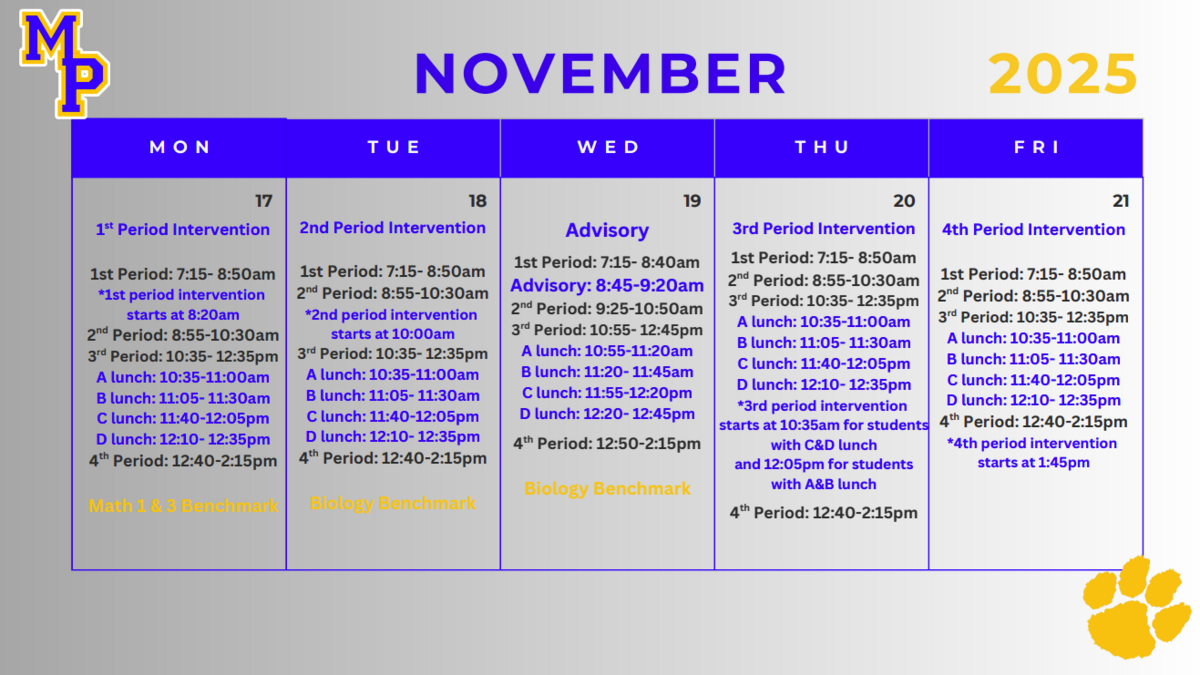 MPHS Leadership Class will be having a canned food drive from today through November 21st. We are asking students and staff to bring in non-perishable food items to donate to those in need. Students will bring food items to the media center at the beginning of 1st Block. Cans donated last week will also count toward the ice cream party this week.