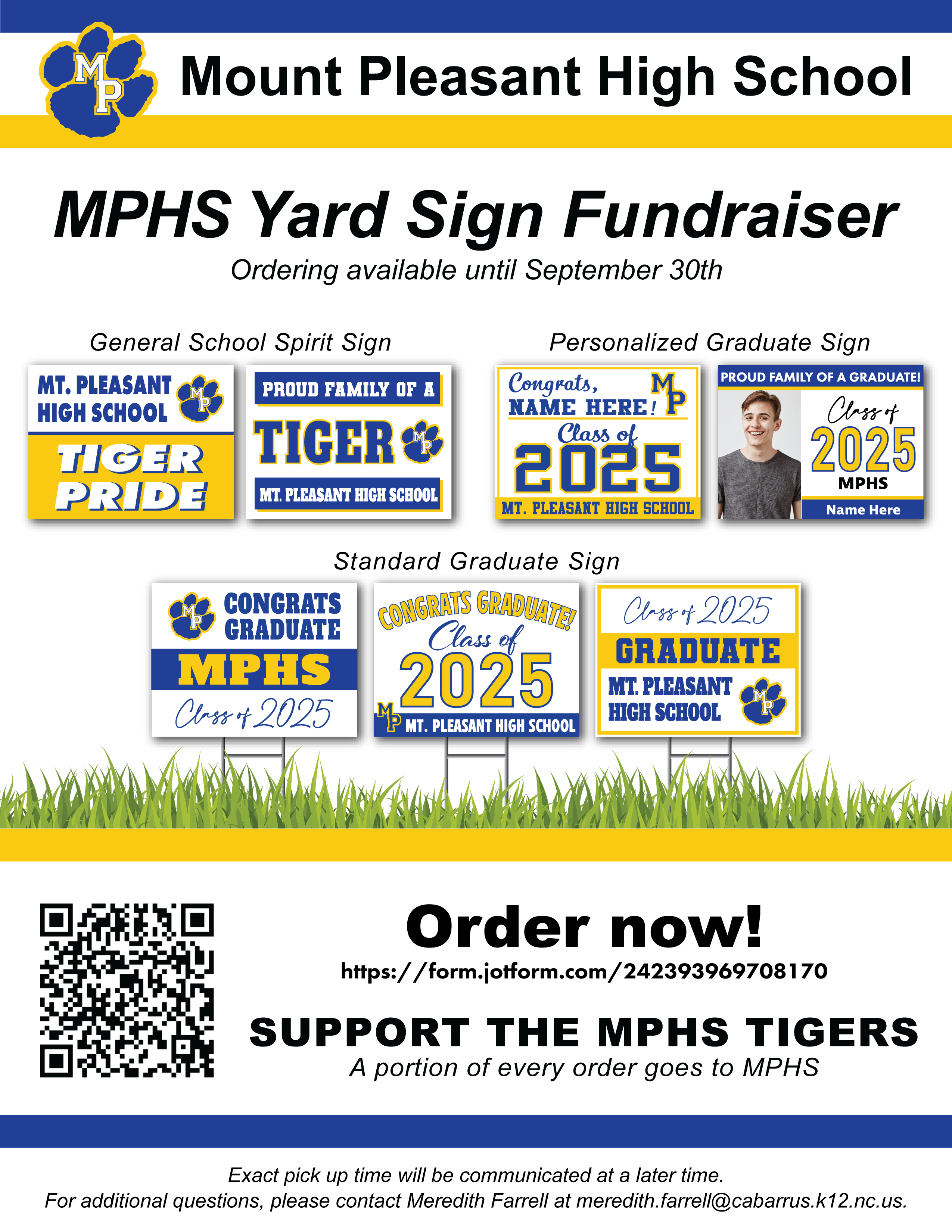 We are excited to offer a way to display TIGER PRIDE in our community! Senior & school spirit yard signs are on sale until Sept. 30th. All profits from this fundraiser will support student celebrations and activities. Thank you for supporting our school and our students! You can order your yard sign through this link or QR code on flyer: