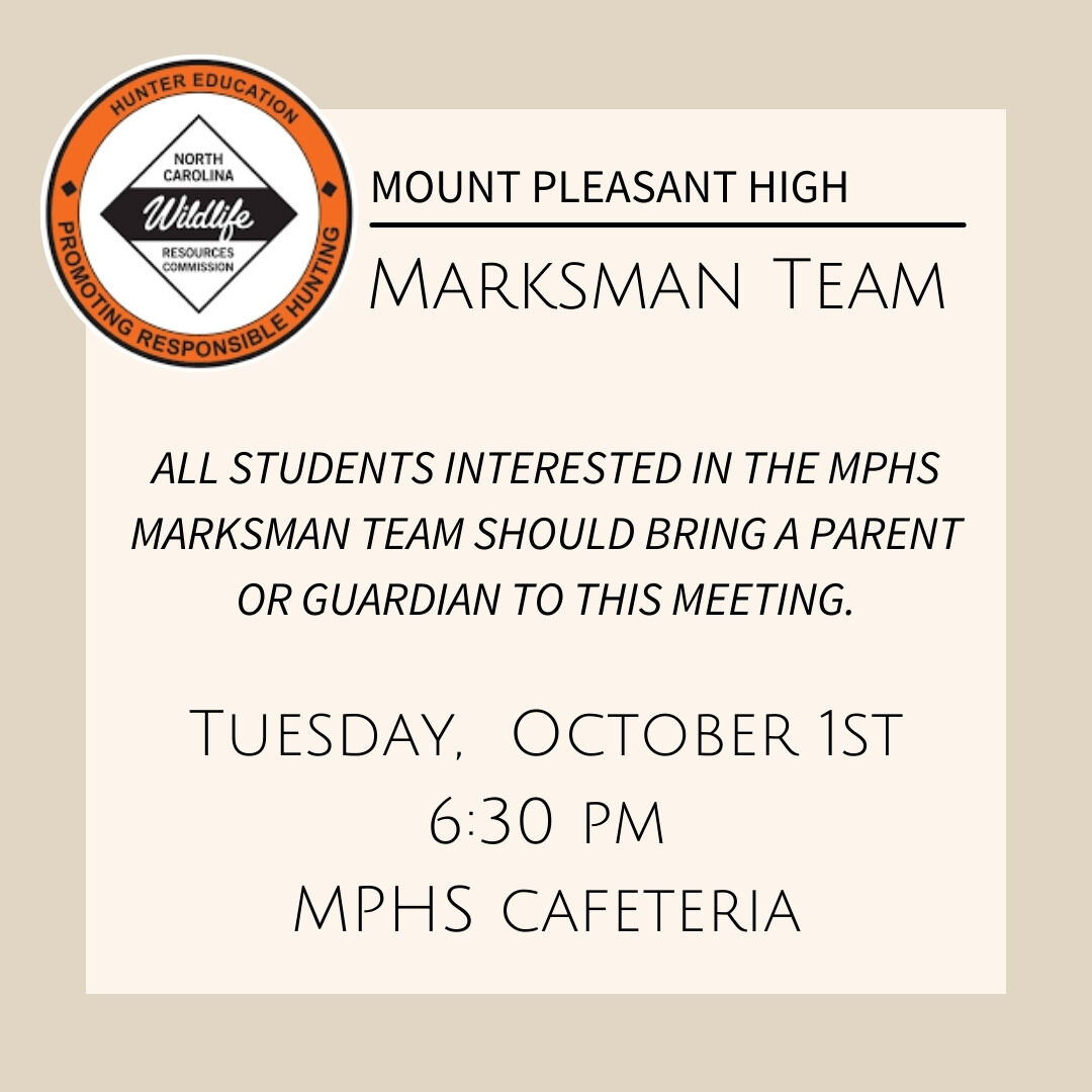 Families of students who are interested in the Marksman Team: There will be a MPHS Marksman Team interest meeting in the MPHS cafeteria on Tuesday, October 1st at 6:30pm. This is a required meeting for both students and parents if you wish to participate on the team this year.