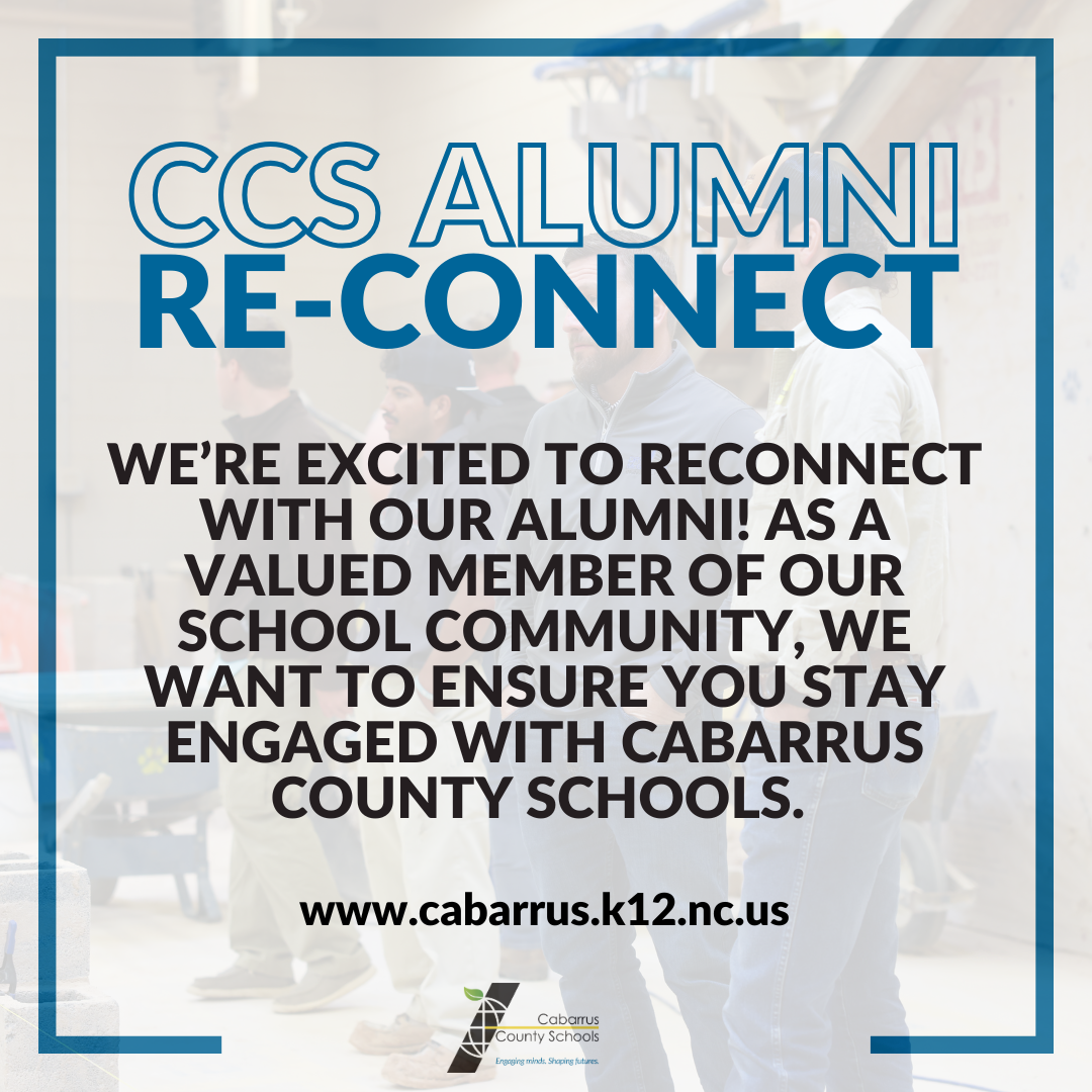 We’re excited to reconnect with you! As a valued member of our school community, we want to ensure you stay engaged with Cabarrus County Schools. To help us strengthen our connection, we kindly ask you to take a few moments to share your contact information by completing the short survey linked below. Your participation will help us celebrate your achievements, share important updates, and create meaningful engagement opportunities for our alumni network. Thank you for being an integral part of our CCS legacy!