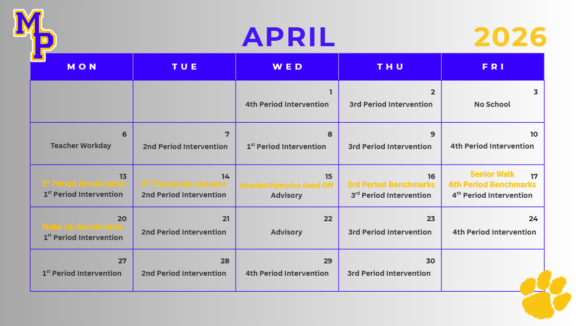 Please pay special attention to the week of April 13th- 17th. Students in Biology, English II, Math 1 & Math 3 will be taking their second benchmark for the semester. We will be doing a flipped...